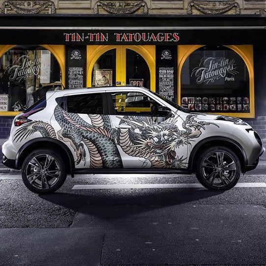 Pour promouvoir son crossover Juke lors du Mondial du tatouage, Nissan s’est associé avec Tin-Tin. Dans le cadre de ce partenariat, le célèbre tatoueur a personnalisé la voiture du constructeur japonais, en dessinant l’un de ses dragons fétiches.